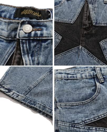 Design: Patch work denim hotpants.Super cute , flattering, soft to the body.unique star patchwork design, zipper fly, button closure, straight fit pocket vintage denim shorts for women
