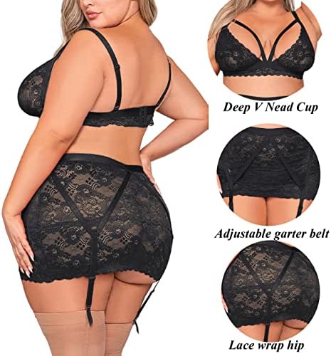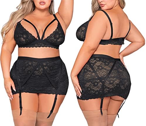 Plus Size Lingerie Set for Women Floral Lace Scallop Trim Bra high waist skirt Garter Lingerie Set