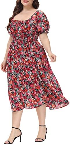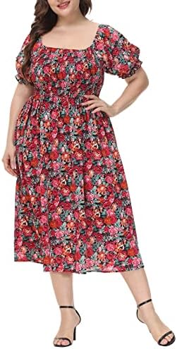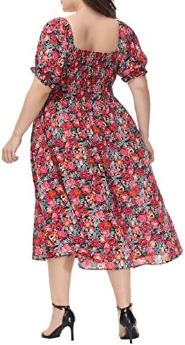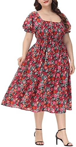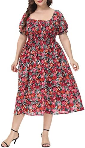 Vintage Square Neck Can Easy Adjust Into Off Shoulder Style & Cute Puff Short Sleeve-plus size dress for women with square neckline shows a litte cleavage,what’s more,the double shoulders of womens dress can be pull down to arm and fits as off-shoulder dress,puff short sleeve design displays elegance fully and suitable for summer,the chest’s fabric is made of wrinkled chiffon,which is well stretchy and fits chest in all sizes better.
