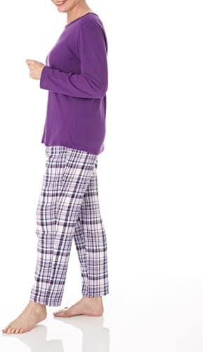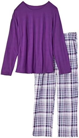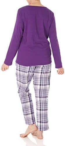 Pajama sleepwear set has a soft cotton knit long sleeve scoop neck pullover top and cozy 100% flannel plaid bottoms, ideal for sleeping or lounging.