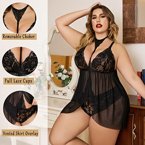 ❤Removable Choker: Plus size babydoll featuring a strappy bodysuit with removabel choker,adjustable spaghetti straps, back hook and eye closure, full lace cups and criss-cross detailing, all this features allows this chemise easy to fit and comfortable to wear