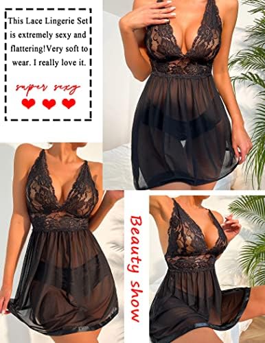 This lace babydoll lingerie set halter chemise for women featuring lace cups with a V-neck, adjustable spaghetti straps, a lace underbust band, open back and a mesh skirt with a satin trim.