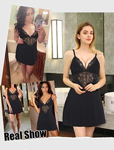 Babydoll nightgown for women featuring plunging deep v neckline with floral lace cups, lace patchwork front, adjustable spaghetti straps for perfect fit.