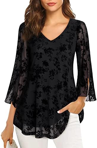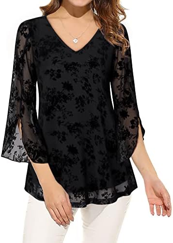【Design Feature】 Flutter 3/4 Long Sleeves/ V Neck/ Loose Fit/ Floral Mesh Double Layer/ High Stretchy/ Flowy Tunic Tops/ Lightweight/ Chiffon Blouses For Women