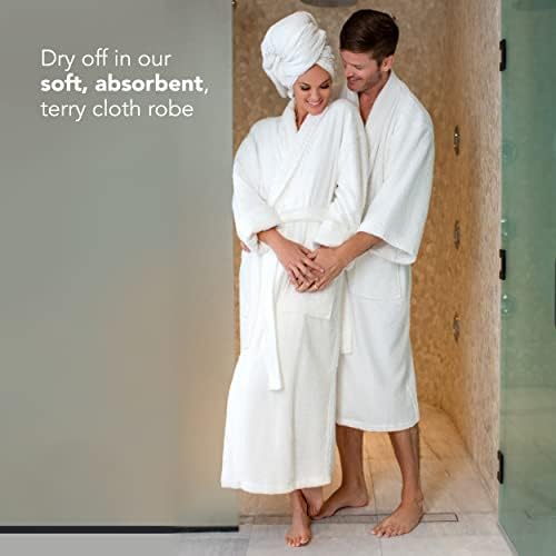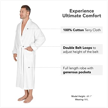 A Great Fit: This white robe is available in Medium/Large size as well as 2XL (XXL) for a great Big & Tall men’s terry robe. The Shawl bathrobe is also 52″ inches long so it will fall at the calf or ankle of most men. It also features full length 22″ inch sleeves than can be rolled up if necessary.