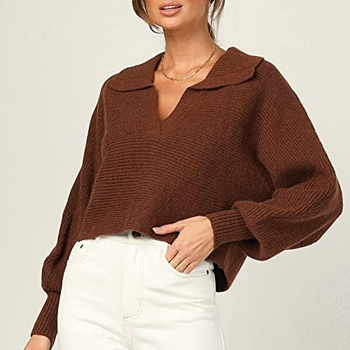 Feature:sexy v neck,polo neckline,puff long sleeve,oversized,loose fit,solid,cuff hem,oversized,chunky knitted,pullover tops