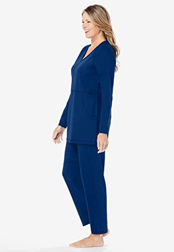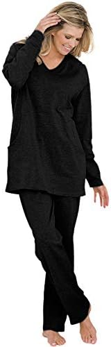 Nothing is as soft and breathable as pure cotton, and these pajamas do not disappoint. A raglan sleeve top has a nifty kangaroo pocket to carry your things, and a pair of relaxed pants with a full elastic waistband are the most comfortable pair you’ll wear. Great for sleeping in or hanging around the house. Average – Top: 30″ length; pants 28″ inseamPetite – Top: 30″ length; pants 27″ inseamTop has kangaroo pocketFull elastic waistbandPure cotton; importedMachine wash