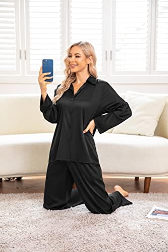 Ekouaer Womens Satin Pajamas Set Classic Long Sleeve Button Down Couple Sleepwear Soft Silk Loungewear With Pockets