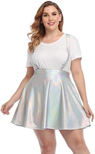 Our mission is to provide you with the COOLEST PLUS SIZE RAVE CLOTHES FOR WOMEN. Available in space silver, gold foil, and holographic, these skater skirts with suspenders are perfect for costumes.
