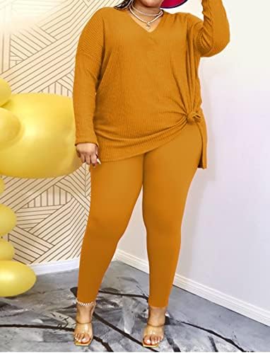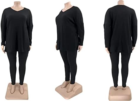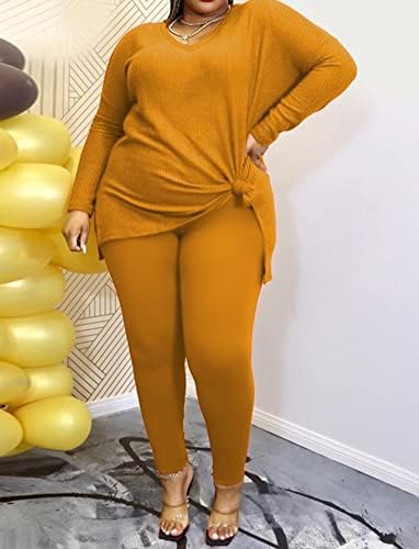 2 Piece Set Outfit for Women Plus Size – Sexy Long Sleeve V Neck Doule Split Ribbed Knit Sweater T-Shirt Tee Shirts Tops Bodycon Long Pants Set Tracksuit Sportwear Clubwear Loungewear