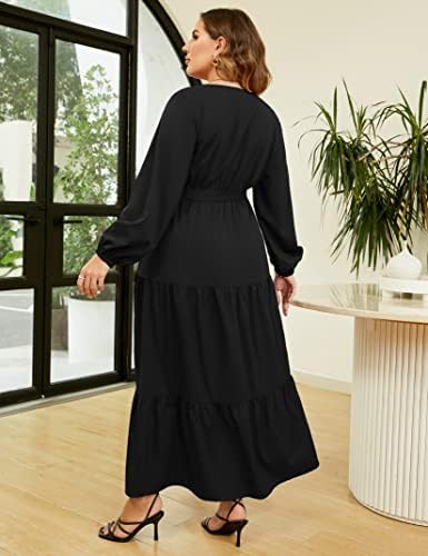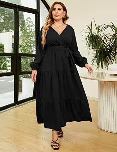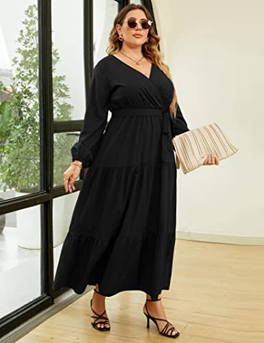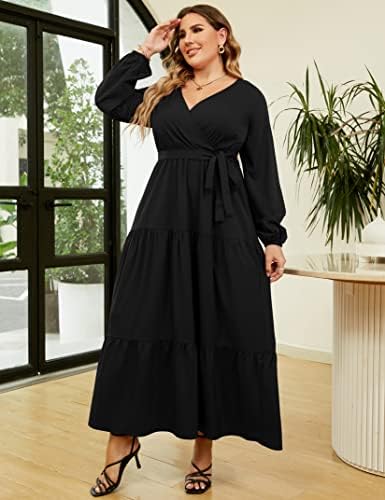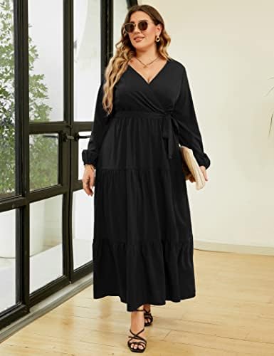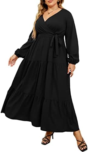 DESIGN: This maxi dress for plus size women is above ankle length, wrap design, v neck, elastic high waist with a belt ties front or back for a bowknot, ruffle and pleated casual style. Comes in solid color: black, green, and pink; Flower design: black, blue navy blue yellow and pink. Five sizes: L, X, 2X, 3X, 4X, 5X