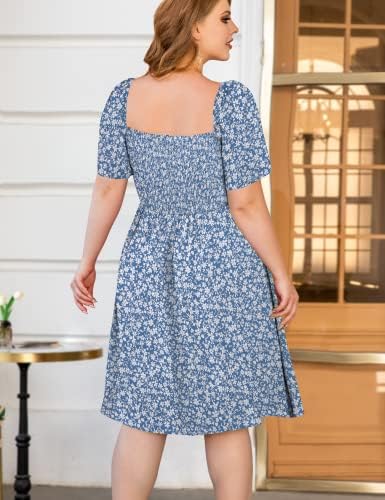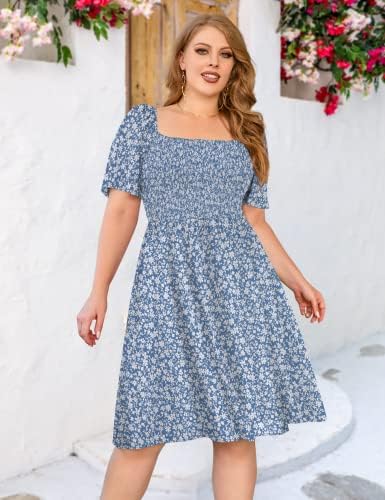Features: Plus size summer dresses, stretchy smocked bodice, plus size dress for women, bohemian floral print dress,midi dress, square neck, short sleeve;