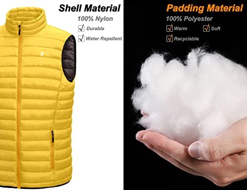 Water Repellent: The shell and lining of quilted puffer vest is 100% Nylon with DWR (durable water repellent)