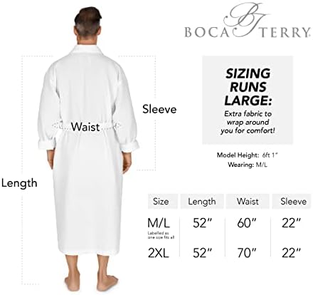 A GREAT FIT: This Men’s Waffle Hotel Robe is available in White in both Medium/Large and XX-Large (2X). These Shawl bathrobes are 52″ inches long so it will fall at the calf or ankle of most men. It also features full length 22″ inch sleeves than can be rolled up if necessary. The 2XL size is a perfect fit for Big & Tall guys looking for a plus size mens robe. Review the size chart image to find the best full size robe.