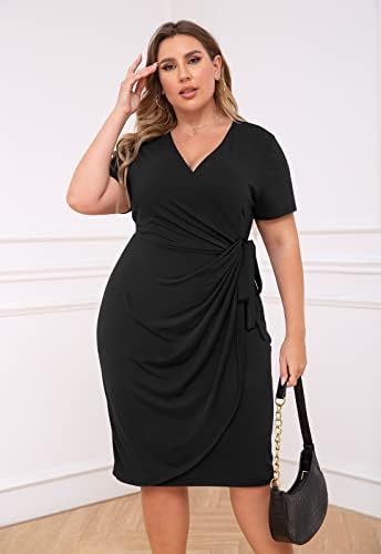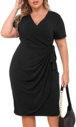 Features: This classic plus size wrap dress has a modest knee length and the v-neck provides plenty of coverage, while still looking sexy. Regular short sleeve, tulip hem,the ruching design and attached tie at the waist is very flattering and hides a lot of imperfections in the midsection, and hugs your curves in all the right places,which make you feel more confident.