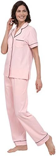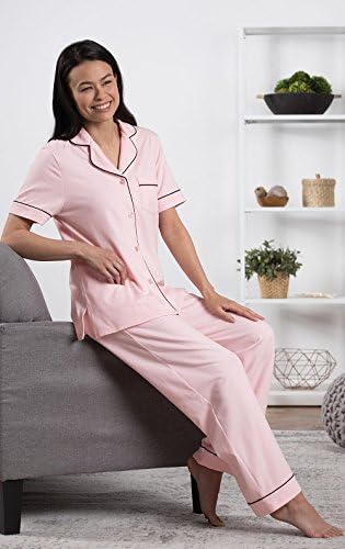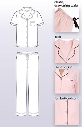 Breathable Cotton Jersey – Short sleeve, button-front top and full-length classically styled two-piece pj set; features a notched collar, chest pocket, elegant piping on the trim, and an elastic, drawstring waist.