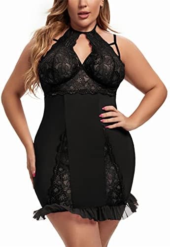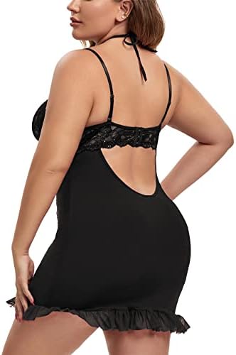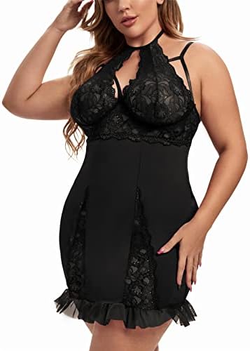 Women’s Sexy Plus Size Lingerie Halter Cross straps Babydoll Lace Trim Chemise Sleepwear