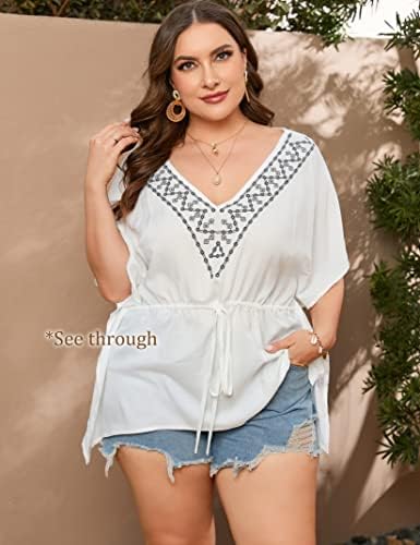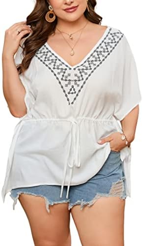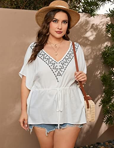 Stylish Design:This plus size summer tops for women summer design with emproider v neck,drop shoulder,short sleeve and drawstring waist belt.Loose fit style could hide belly fat easliy.