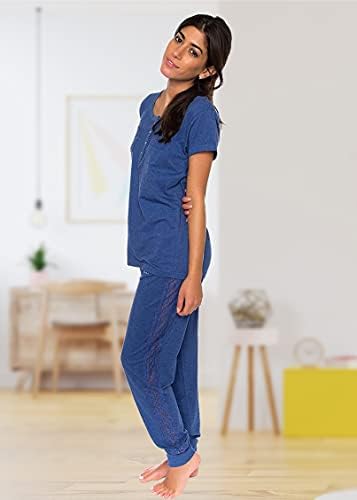 Cotton-blend knit pajama set features feminine lace accents on both pieces. Pull-on pants flaunt sheer lace insets from side hip to hem for a flirty, peek-a-boo effect. Lace also trims the top’s chest pockets