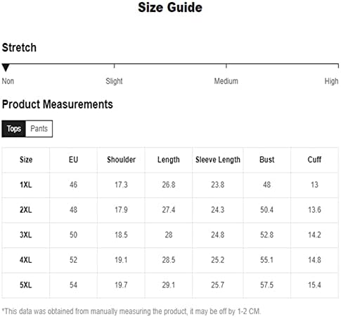 Bust Size: (X-Large) 48 inch; (XX-Large) 50.4 inch; (3X-Large) 52.8 inch; (4X-Large) 55.1 inch; (5X-Large) 57.5 inch;