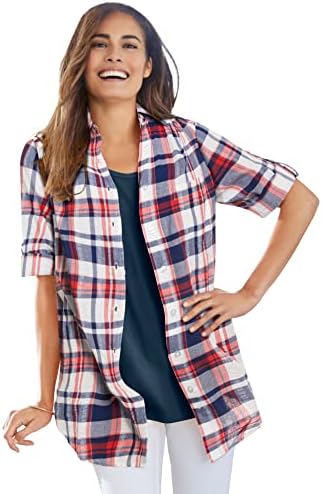 Classic cotton seersucker shirt with roll-tab sleeves from elbow to short sleeves. Chest pocket and button front. Shirt collar Shirttail hem 30” tunic length Woven cotton, imported Machine washable