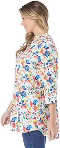 With a minimal mandarin collar and deep Y-neck, this woven tunic features a button tab on the placket to hold it closed and add fun styling. A relaxed fit with back yoke makes it comfortable and roomy, and three-quarter sleeves with button cuffs provide the perfect amount of arm coverage. Shirttail hem 30″ tunic length Woven rayon, imported Machine washable