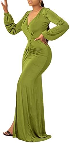 SAMACHICA Women’s Deep V Neck Wrap Long Bishop Sleeve High Waisted Ruched Flowy Maxi Dress with Slit