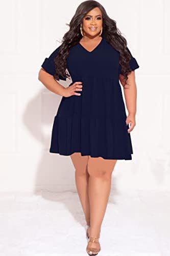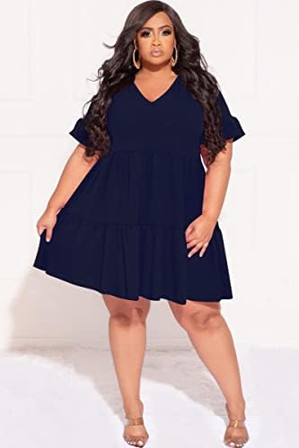 【Features】V Neckline, Solid Color, Ruffle Hem, Puff Short Sleeves, Pleated Loose Hem Summer Dress, Simple And Plain.