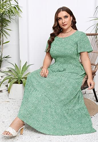 Women’s Plus Size Casual Bohemian Maxi Dress Scoop Neck Smocked Flowy Ruffle Hem Boho Summer Dresses