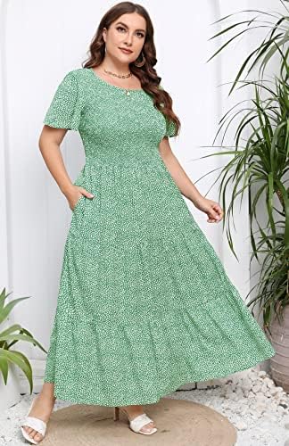 Plus Size Elegant Boho Dress for Women Short Sleeve Scoop Neck Tiered Smocked Maxi Dress with Packets